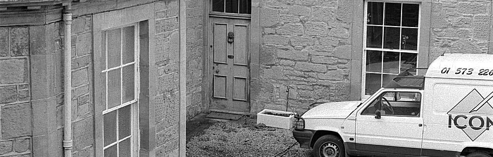 A horizontal slice of a full VERTICAL frame from the Contax showing the publisher's scruffy entrance yard and Andy's Seat Terror (OK, Terra) diesel boneshaker van. The fierce lion doorknocker dead center has been unpainted and remained uncleaned for the last hundred years. The door is never opened, for beyond it sits an ancient skeleton covered in cobwebs. The skeleton is, regrettably, that of one of our cats' votive offerings to the god of clean carpets, and the reason we don't open the door is because it would scrape it all over the floor.
